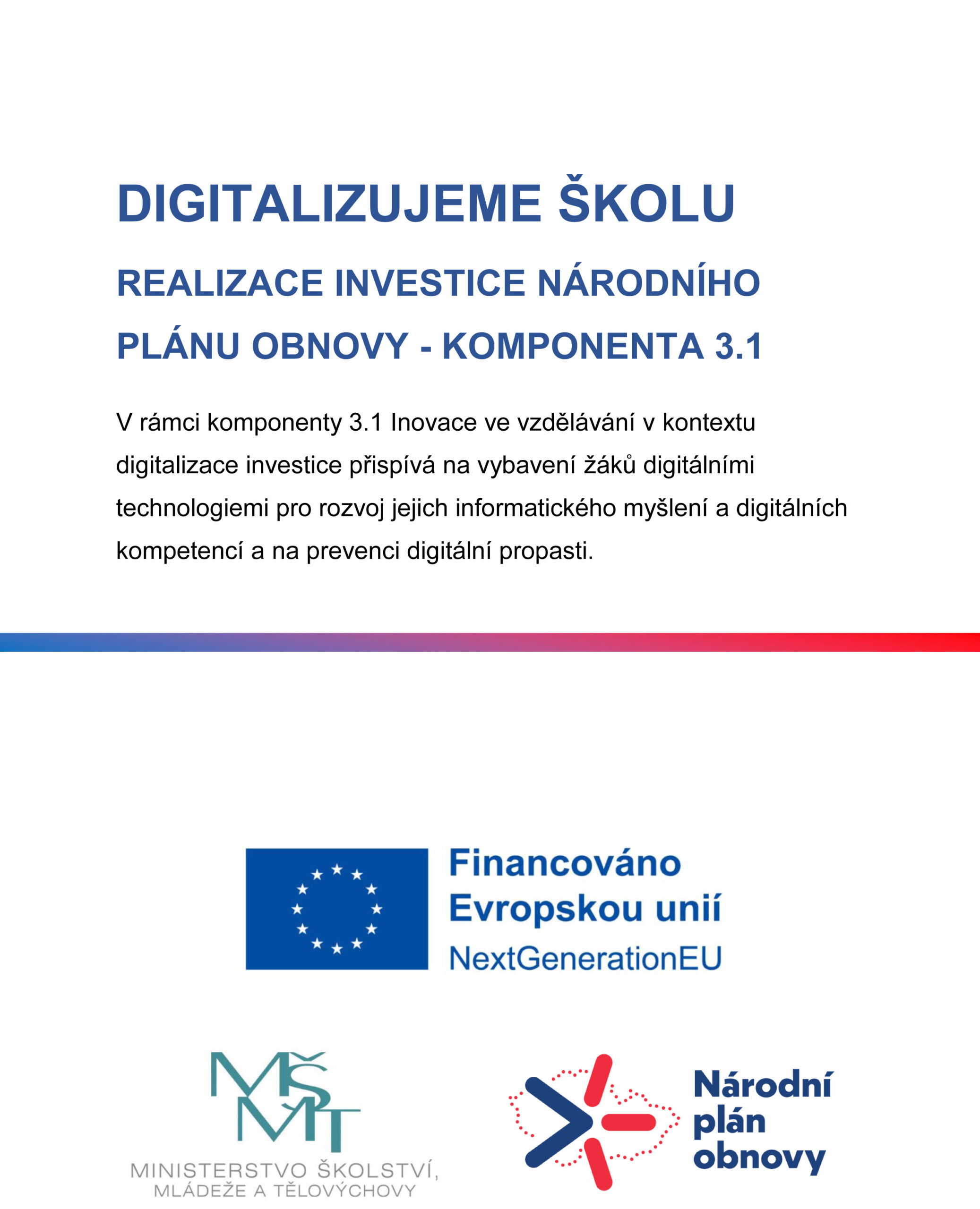 V rámci komponenty 3.1 Inovace ve vzdělávání v kontextu digitalizace investice přispívá na vybavení žáků digitálními technologiemi pro rozvoj jejich informatického myšlení a digitálních kompetencí a na prevenci digitální propasti.